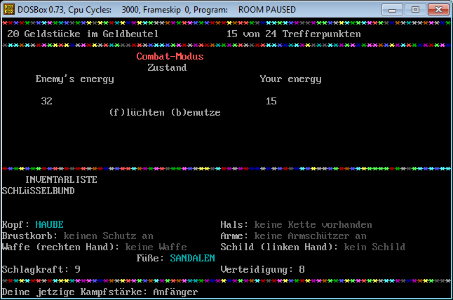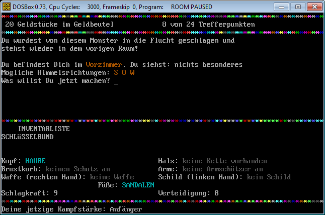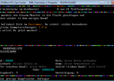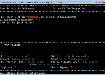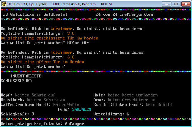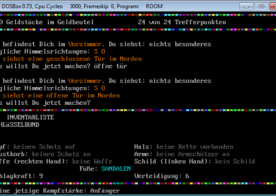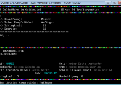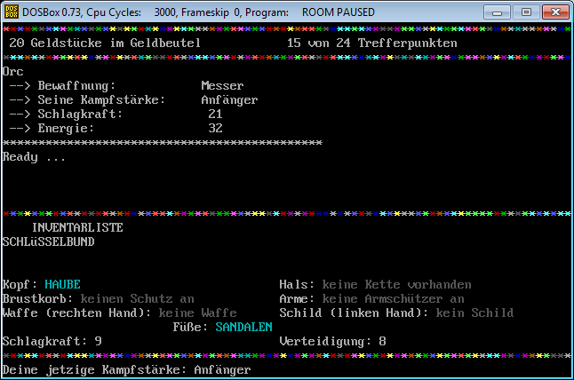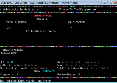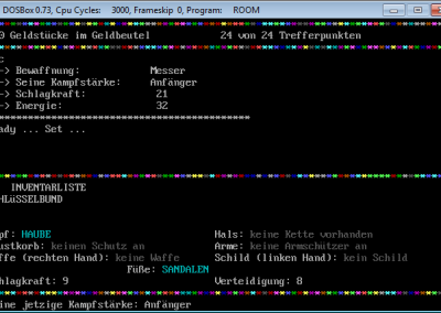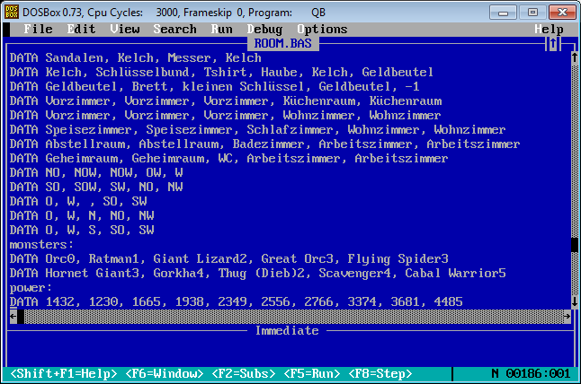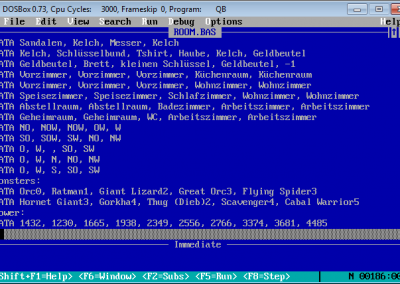 Similiar to RPG/Adventure games you can pick up items, equip them and use them or lay them back on the floor if you like to do so. There are a few types of enemies, regarding to the source code (see screenshot), but as far as I can remember only three of them were shown, the ratman, the orc and the great lizard. The rooms, weapons, equipment and so on were not hard coded, but changeable via lines of DATA as one of the screenshots shows it. Maybe one little story, I tried to work on Room II, wanted to enhance the first version, but let it go because reading the code – I remember many lines of IF statements – and amending it was too complicated and I gave up. ![]()
